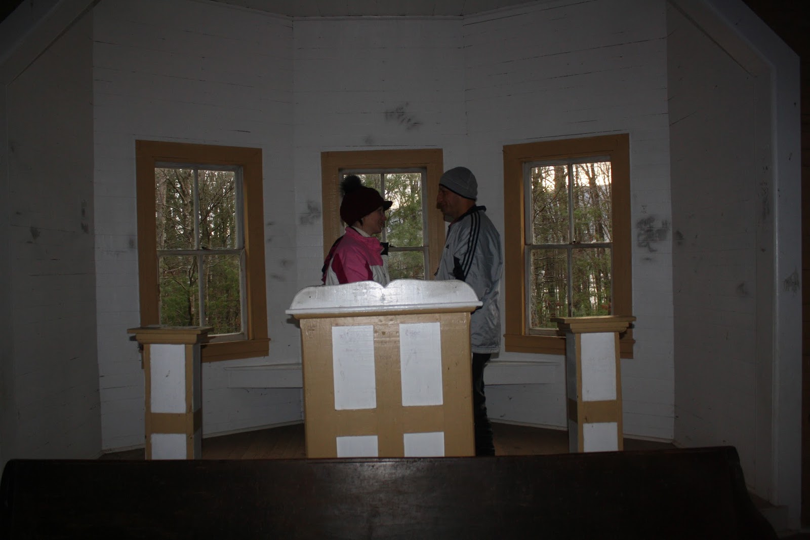 I wanted to capture the very moment I proposed, so I lugged a tripod, camcorder, and camera in my backpack. Amanda questioned why I was bringing my large camera and camcorder when her camera did both, and I told her I wanted to mount the camcorder on the tripod to video us standing in front of the falls. To sell it, I used the camcorder a lot along the way and I set up the tripod several times to take selfies. I even joked about getting married when we took a break to thaw off inside the Missionary Baptist Church. (In fiction, that would be called “foreshadowing”, but it came back to bite me in the end.)